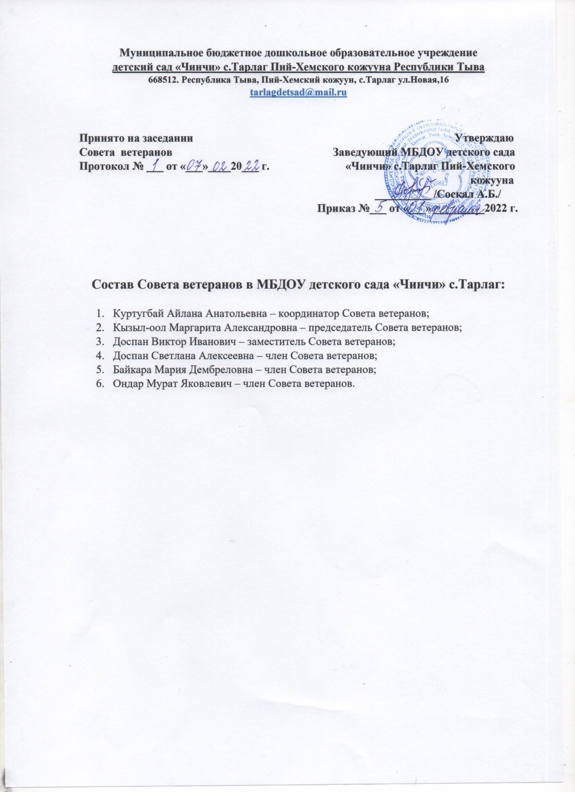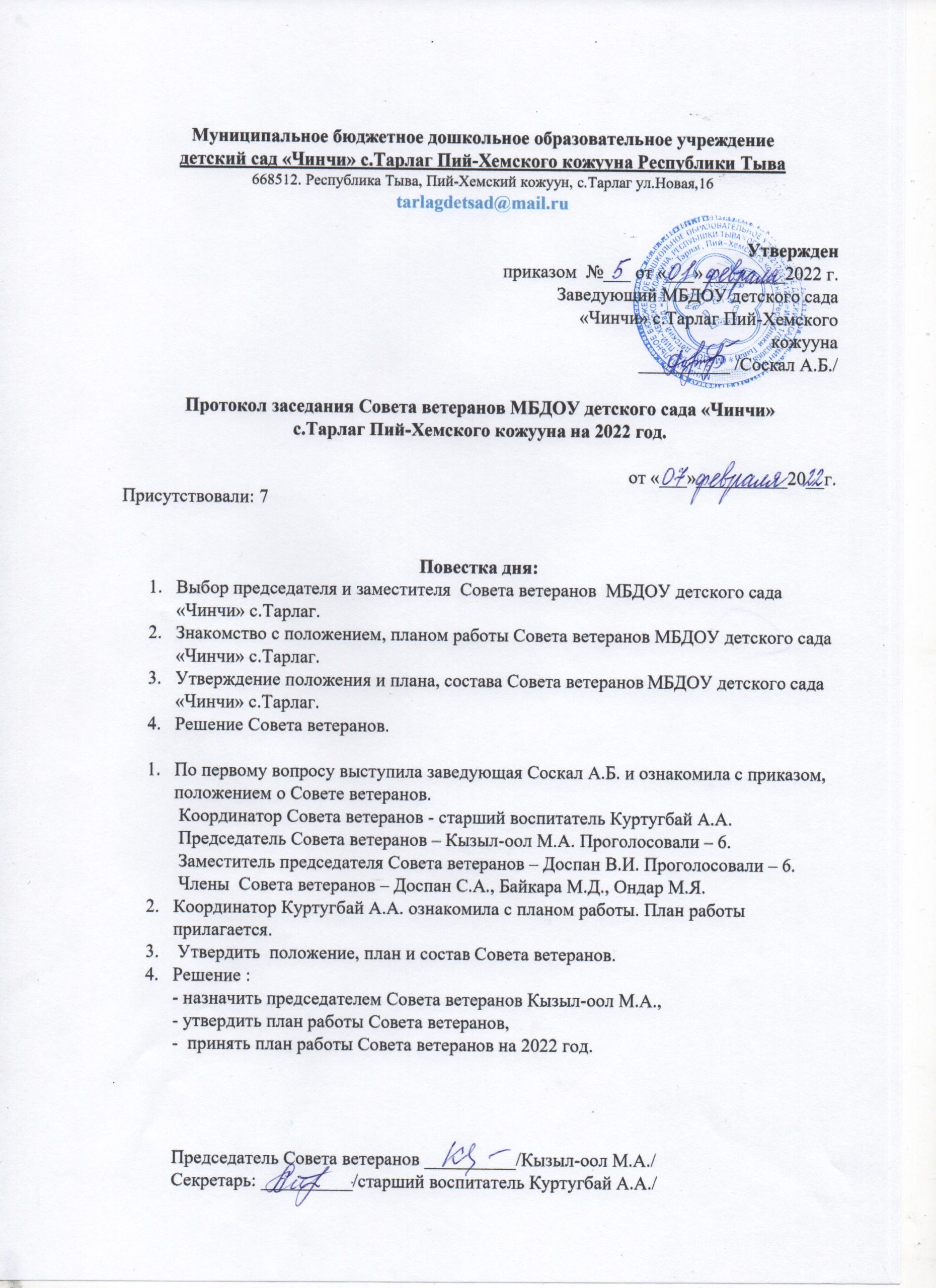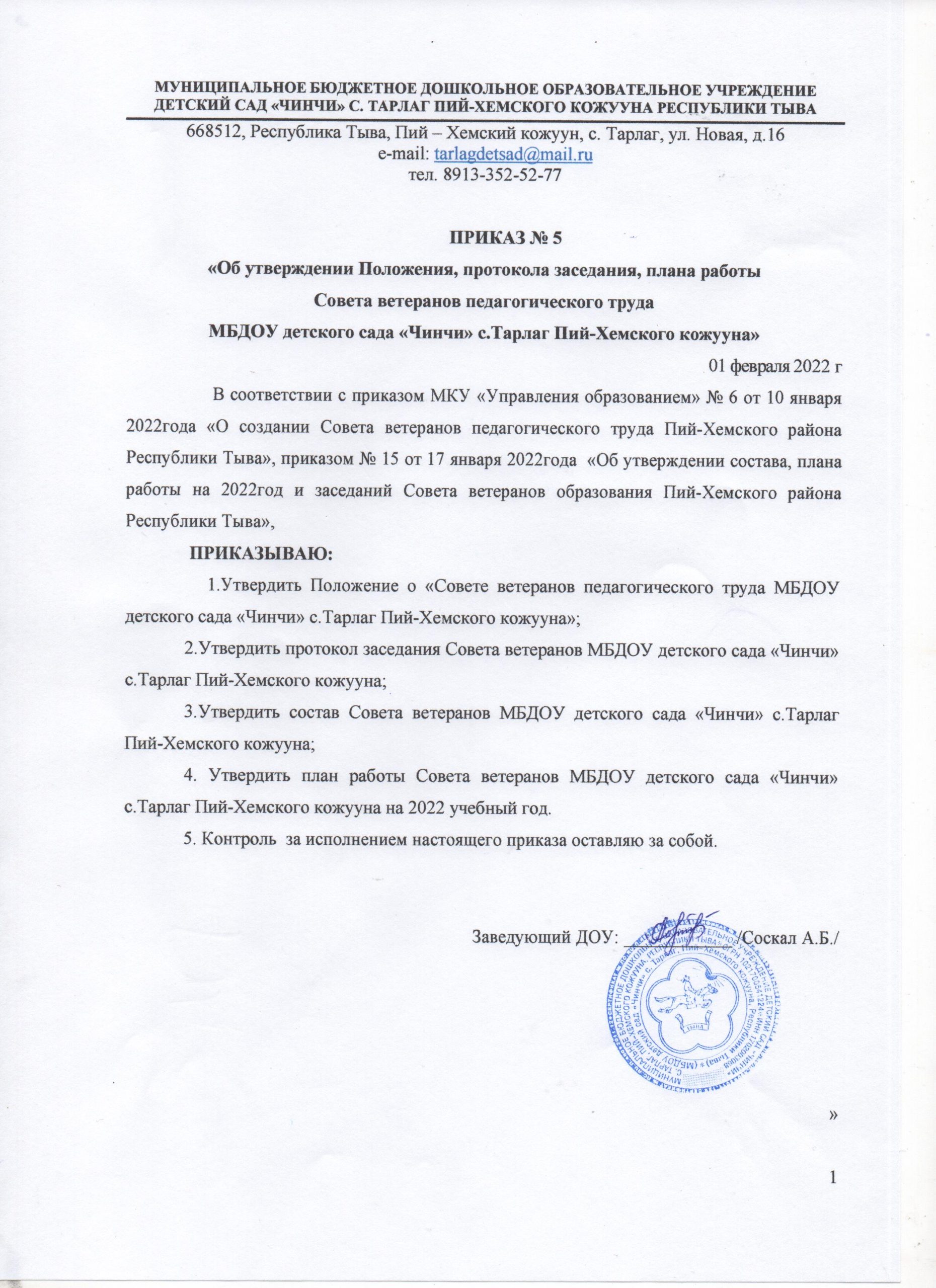 Приказ «Об утверждении Положения, протокола заседания плана работы Совета ветеранов»Скачать