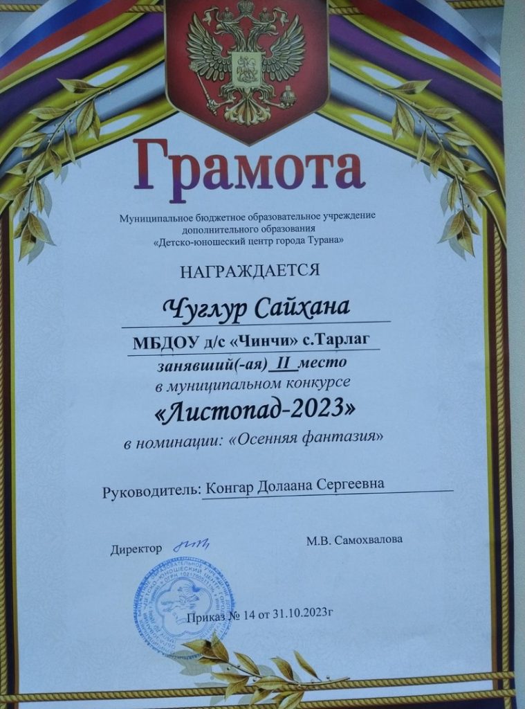 Таким образом, в данном конкурсе наша воспитанница старшей разновозрастной группы МБДОУ детского сада «Чинчи» с.Тарлаг Чуглур Сайхана заняла 2 место.
